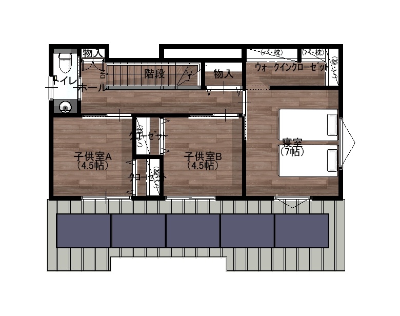 2階には4.5帖の子ども部屋を2室と、7帖の寝室+ウォークインクローゼットを配置。