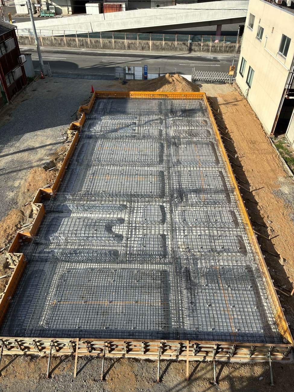 現在は建物の基礎工事中、鉄筋組み作業が完了しました。
