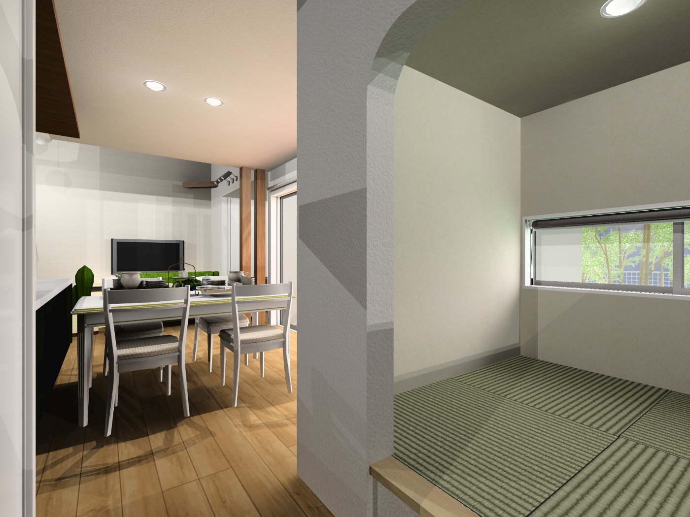 リビングの南側には小上がりの畳コ-ナ-がありリビングと一体に使用出来ます。