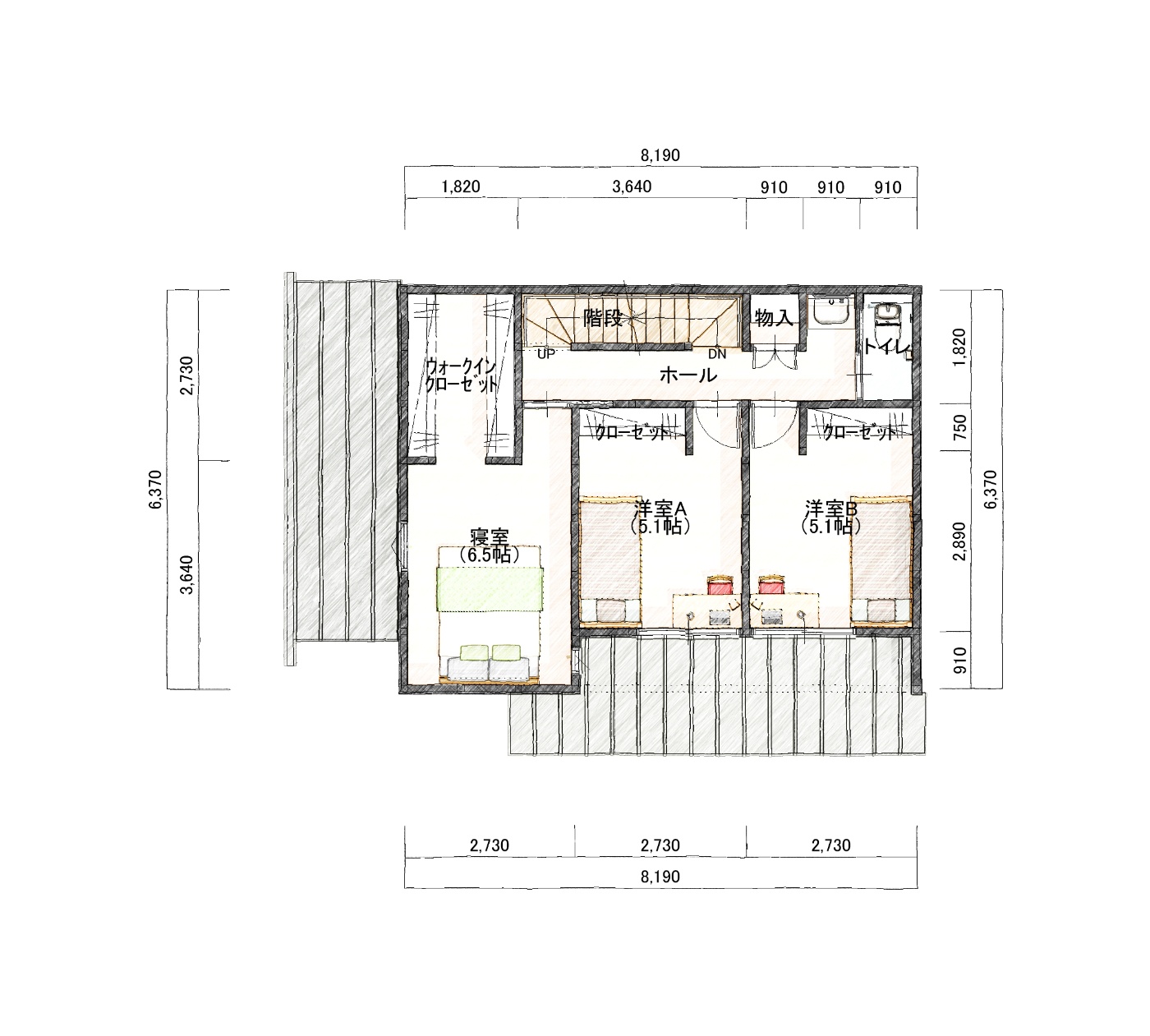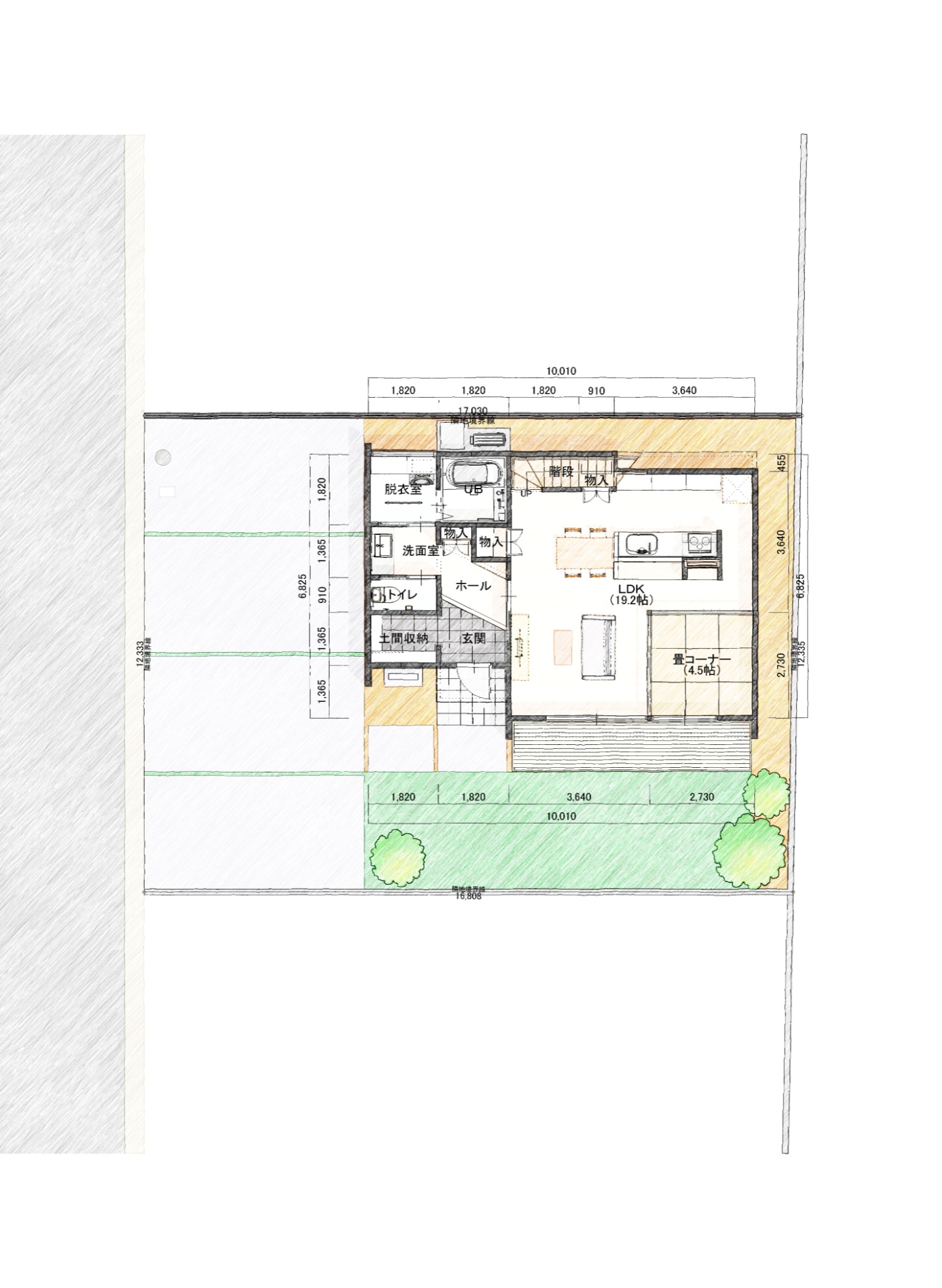 延べ面積108.89㎡、32.93坪の南入り玄関の住宅プランです。