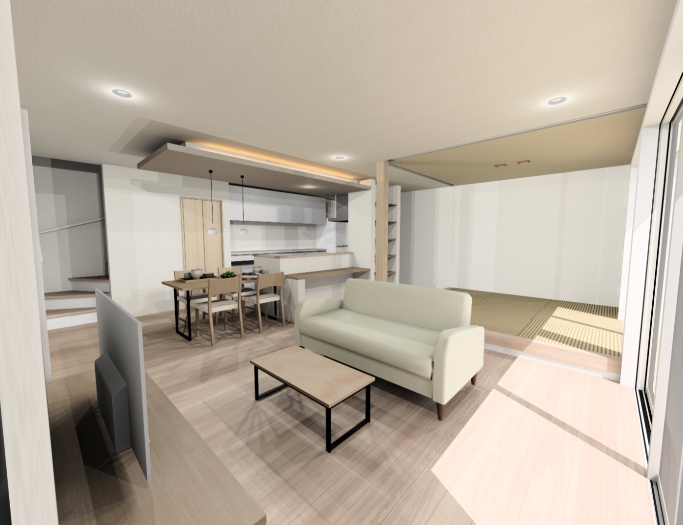 LDKをL型に配置し、L型を埋めるように畳コーナーを配置することで広々としたLDK空間になっています。