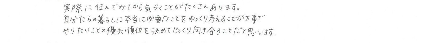 お引渡後10年様のMより 実際に住んでみてから気づくことがたくさんあります。 自分たちの暮らしに本当に必要なことをゆっくり考えることが大事で やりたいことの優先順位を決めてじっくり向き合うことだと思います。